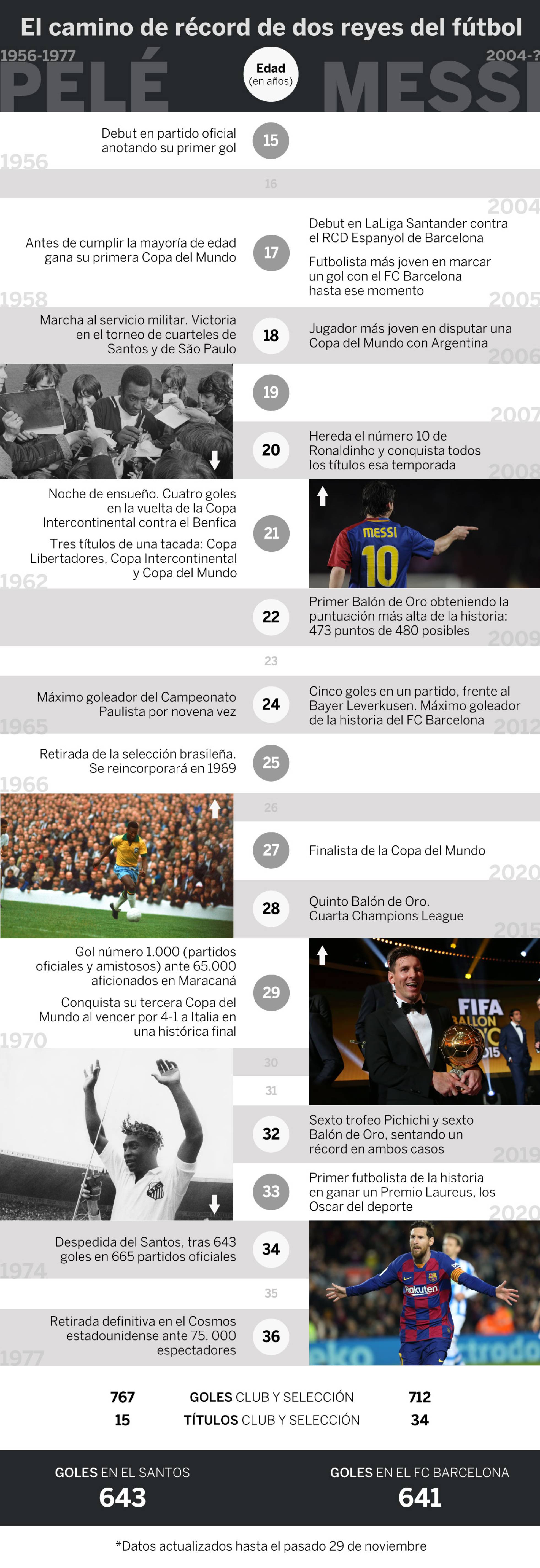 Pele spent the vast majority of his career with Santos before a two-year spell with New York Cosmos in the United States. Messi joined Barcelona aged 13 from Newell’s Old Boys and has played in Catalonia ever since.