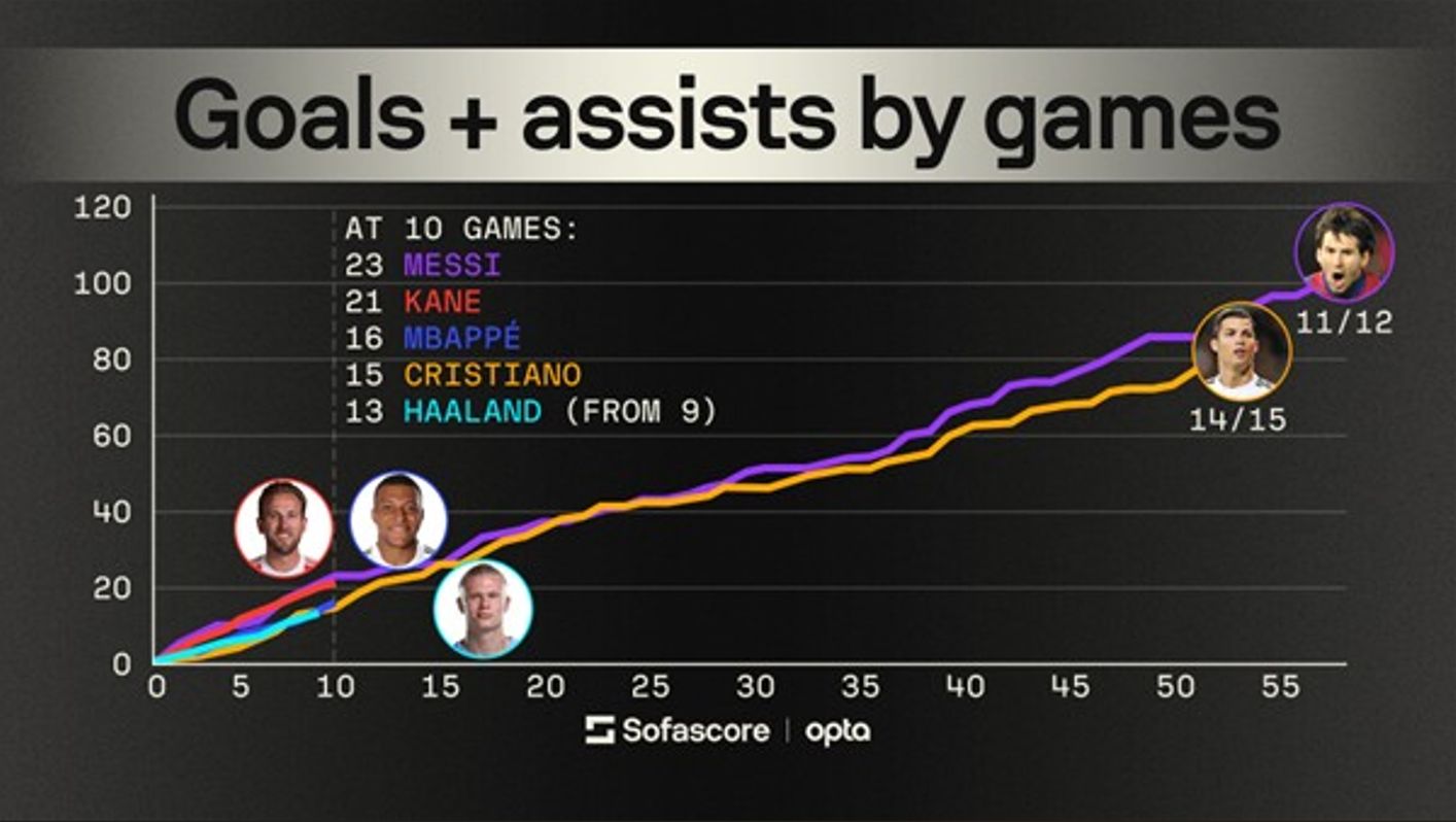 Interestingly, despite a start that any striker would be proud of, with 12 goals in 9 matches, Haaland’s been outscored by both Mbappé and Kane, who’s astonishing 18 goals in 10 games have pulled parallels to Cristiano Ronaldo’s and Messi’s brutal records, especially Messi’s 2012 when he scored 91 goals in a calendar year. Such steady scoring across such a long period of time seems highly unlikely to repeat itself, but should Kane keep this rhythm up, he’ll hit 95 goals after 53 games. In his record-breaking year, Messi had 61 goals after 53 games played… the world will be watching.